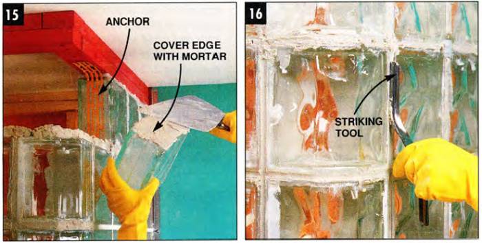 As you read, note the tools (available at complete hardware or building centers) and special materials used — white mortar, reinforcing wire, metal anchors, and expansion strips (available from glass block dealers).