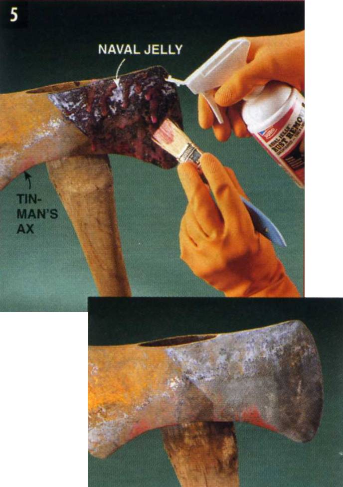 Trying to sand rust off some metal surfaces may be impossible — certainly a royal pain. When this happens, slip on a pair of rubber gloves and eye protection and spread on the naval jelly (Photo 5).